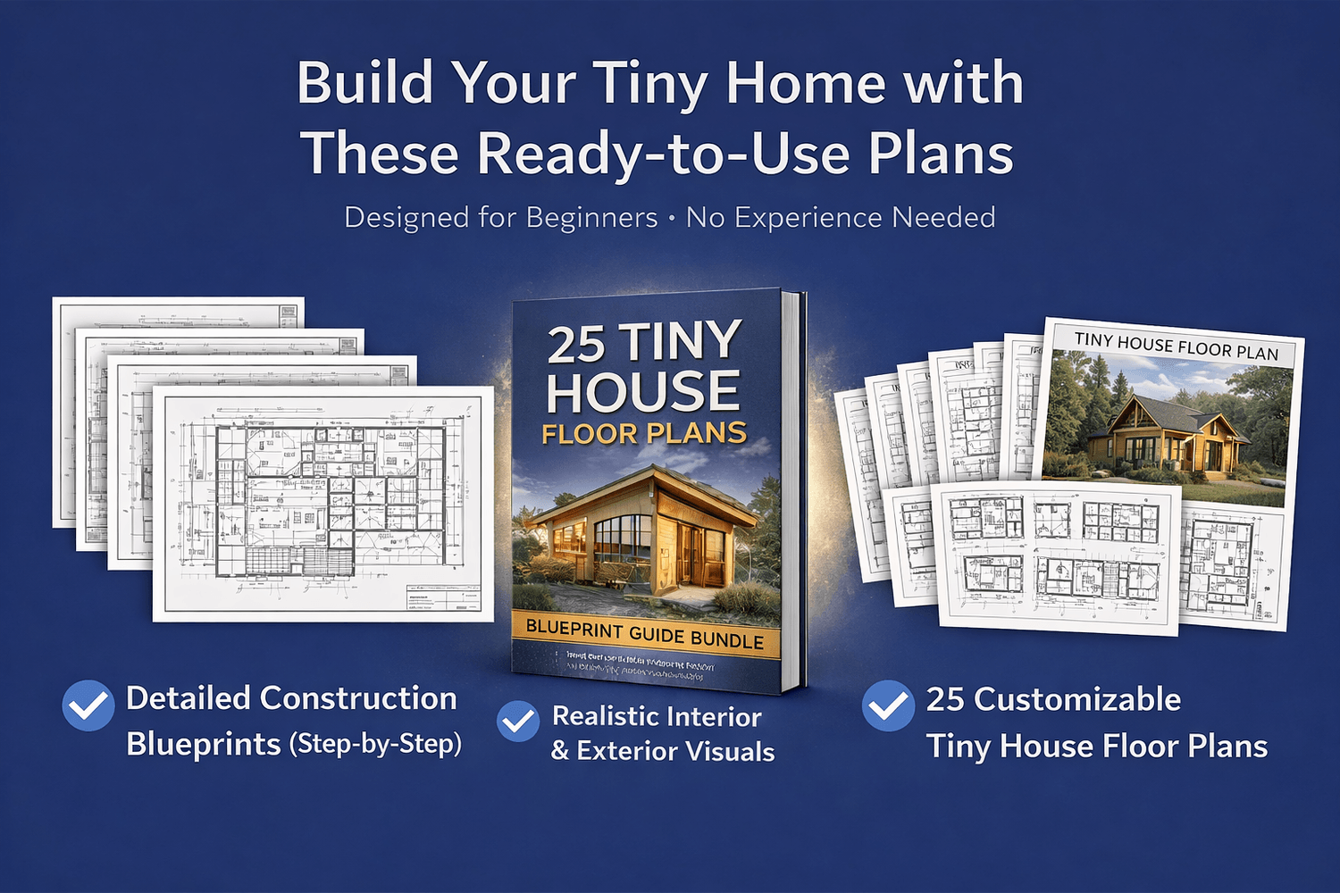 You’ll get a download with all 25 tiny house floor plans. Each one shows the layout, room sizes, and how the space is used.